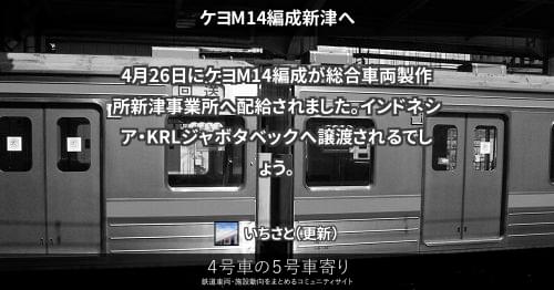 205系(東) ケヨM14編成新津へ 4月26日にケヨM14編成が総合車両製作所新津事業所へ配給されました。インドネシア・KRLジャボタベックへ譲渡されるでしょう。 2019/04/26 2019/05/01 いちさと 205系(東)