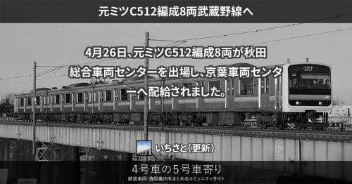 209系 元ミツC512編成8両武蔵野線へ 4月26日、元ミツC512編成8両が秋田総合車両センターを出場し、京葉車両センターへ配給されました。 2019/04/26 2019/05/01 いちさと 209系