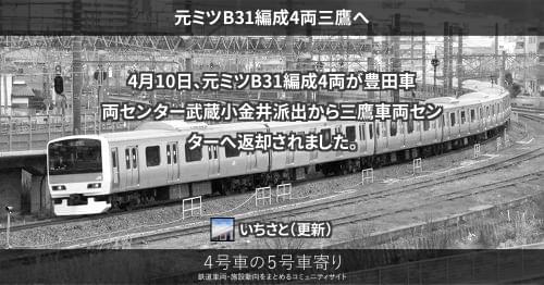 E231系 元ミツB31編成4両三鷹へ 4月10日、元ミツB31編成4両が豊田車両センター武蔵小金井派出から三鷹車両センターへ返却されました。 2019/04/10 2019/04/12 いちさと E231系