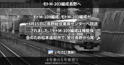 E257系 モトM-203編成長野へ モトM-109編成、モトM-203編成が、4月15日に長野総合車両センターへ回送されました。 (モトM-109編成は機能保全のため松本返却中で、翌日長野から尾久へ返却されています。機能保全に伴う回送は更新対象外です。) 2019/04/15 2019/04/17 いちさと E257系