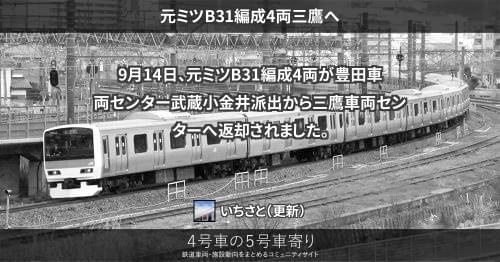 E231系 元ミツB31編成4両三鷹へ 9月14日、元ミツB31編成4両が豊田車両センター武蔵小金井派出から三鷹車両センターへ返却されました。 2019/09/14 2019/09/15 いちさと E231系