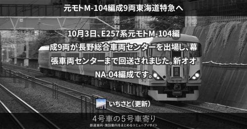 E257系 元モトM-104編成9両東海道特急へ 10月3日、E257系元モトM-104編成9両が長野総合車両センターを出場し、幕張車両センターまで回送されました。新オオNA-04編成です。 2019/10/03 2019/10/04 いちさと E257系