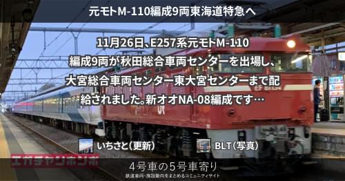 E257系 元モトM-110編成9両東海道特急へ 11月26日、E257系元モトM-110編成9両が秋田総合車両センターを出場し、大宮総合車両センター東大宮センターまで配給されました。新オオNA-08編成です。 2019/11/26 いちさと E257系
