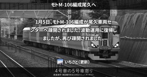 E257系 モトM-106編成尾久へ 1月5日、モトM-106編成が尾久車両センターへ疎開されました。波動運用に復帰しましたが、再び疎開されました。 2020/01/05 2020/01/07 いちさと E257系