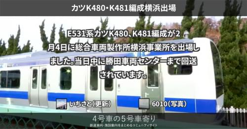 E531系 カツK480・K481編成横浜出場 E531系カツK480、K481編成が2月4日に総合車両製作所横浜事業所を出場しました。当日中に勝田車両センターまで回送されています。 2020/02/04 いちさと E531系