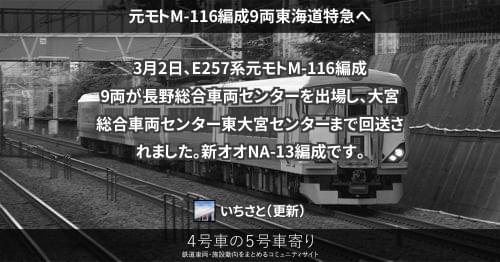E257系 元モトM-116編成9両東海道特急へ 3月2日、E257系元モトM-116編成9両が長野総合車両センターを出場し、大宮総合車両センター東大宮センターまで回送されました。新オオNA-13編成です。 2020/03/02 いちさと E257系