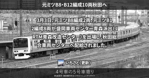 E231系 元ミツB8・B12編成10両秋田へ 3月3日、元ミツB8編成2両、元ミツB12編成8両が盛岡車両センター青森派出(JRTM青森改造センター)を出場し、秋田総合車両センターへ配給されました。 青森で6M4T化、機器更新を施工済みです。 ※車番未確認ですが反映致しました。 2020/03/03 いちさと E231系