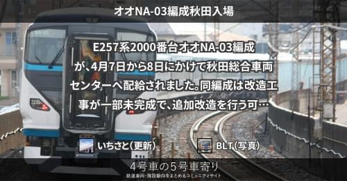 E257系 オオNA-03編成秋田入場 E257系2000番台オオNA-03編成が、4月7日から8日にかけて秋田総合車両センターへ配給されました。 同編成は改造工事が一部未完成で、追加改造を行う可能性があります。 2020/04/08 いちさと E257系