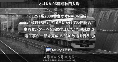 E257系 オオNA-06編成秋田入場 E257系2000番台オオNA-06編成が、7月15日から16日にかけて秋田総合車両センターへ配給されました。 同編成は改造工事が一部未完成で、追加改造を行う可能性があります。 2020/07/16 いちさと E257系