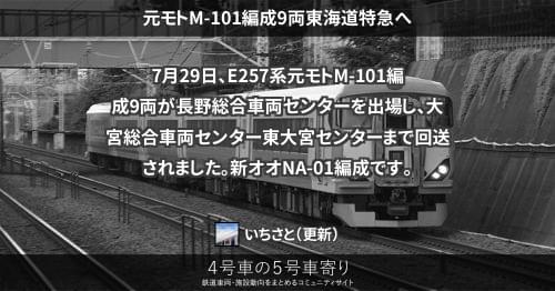 E257系 元モトM-101編成9両東海道特急へ 7月29日、E257系元モトM-101編成9両が長野総合車両センターを出場し、大宮総合車両センター東大宮センターまで回送されました。新オオNA-01編成です。 2020/07/29 いちさと E257系