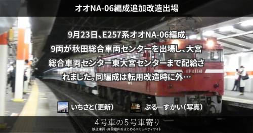 E257系 オオNA-06編成追加改造出場 9月23日、E257系オオNA-06編成9両が秋田総合車両センターを出場し、大宮総合車両センター東大宮センターまで配給されました。 同編成は転用改造時に外装が未了で再入場しており、今回追加改造が行われました。 2020/09/23 いちさと E257系