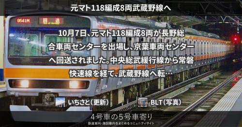 E231系 元マト118編成8両武蔵野線へ 10月7日、元マト118編成8両が長野総合車両センターを出場し、京葉車両センターへ回送されました。 中央総武緩行線から常磐快速線を経て、武蔵野線へ転用された編成で、常磐快速線時代の電気連結器が残っています。 2020/10/07 いちさと E231系