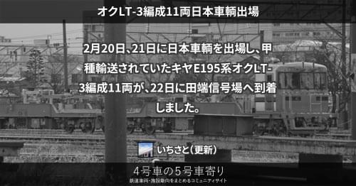 キヤE195系 オクLT-3編成11両日本車輌出場 2月20日、21日に日本車輌を出場し、甲種輸送されていたキヤE195系オクLT-3編成11両が、22日に田端信号場へ到着しました。 2021/02/22 いちさと キヤE195系