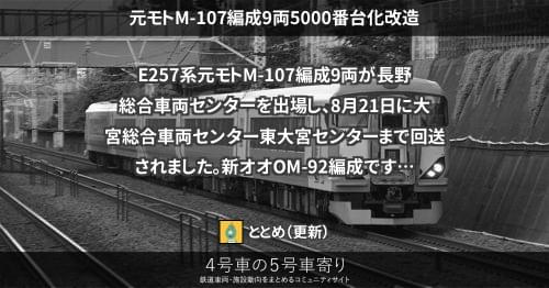 E257系 元モトM-107編成9両5000番台化改造 E257系元モトM-107編成9両が長野総合車両センターを出場し、8月21日に大宮総合車両センター東大宮センターまで回送されました。新オオOM-92編成です。 同編成は5000番台化改造の2本目で、先に出場したオオOM-91編成と同様に波動用と推測されます。 2021/08/21 ととめ E257系