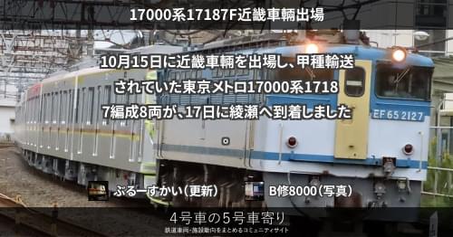 メトロ 17000系17187F近畿車輛出場 10月15日に近畿車輛を出場し、甲種輸送されていた東京メトロ17000系17187編成8両が、17日に綾瀬へ到着しました。 https://4gousya.net/forums/post/17000%e7%b3%bb17187f-%e8%bf%91%e7%95%bf%e8%bb%8a%e8%bc%9b%e5%87%ba%e5%a0%b4%e7%94%b2%e7%a8%ae%e8%bc%b8%e9%80%81/ 2021/10/17 ぶるーすかい メトロ