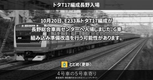 E233系 トタT17編成長野入場 10月20日、E233系トタT17編成が長野総合車両センターへ入場しました。 G車組み込み準備改造を行う可能性があります。 2021/10/20 2021/10/21 ととめ E233系