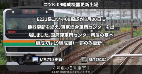 E231系 コツK-09編成機器更新出場 E231系コツK-09編成が8月30日に機器更新を終え、東京総合車両センターを出場しました。 国府津車両センター所属の基本編成では19編成目(一部のみ更新された編成を除く)の機器更新車となります。 https://4gousya.net/forums/post/%e3%82%b3%e3%83%84k-04%e7%b7%a8%e6%88%90%e6%9d%b1%e4%ba%ac%e5%87%ba%e5%a0%b4 2022/08/30 2022/09/10 いちさと E231系