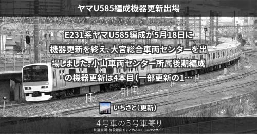 E231系 ヤマU585編成機器更新出場 E231系ヤマU585編成が5月18日に機器更新を終え、大宮総合車両センターを出場しました。 小山車両センター所属後期編成の機器更新は4本目(一部更新の1編成を除く)です。 https://4gousya.net/forums/post/%e3%83%a4%e3%83%9eu585%e7%b7%a8%e6%88%90%e3%81%8c%e6%a9%9f%e5%99%a8%e6%9b%b4%e6%96%b0%e3%82%92%e7%b5%82%e3%81%88%e5%a4%a7%e5%ae%ae%e5%87%ba%e5%a0%b4 2022/05/18 2022/05/23 いちさと E231系