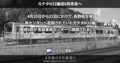 JRの車両その他(東) 元チタN32編成6両青森へ 4月20日から22日にかけて、長野総合車両センターへ配給されていた元チタN32編成6両が青森車両センターへ疎開されました。 2012/04/23 いちさと JRの車両その他(東)