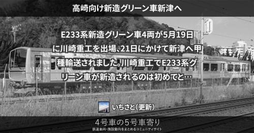 JRの車両その他(東) 高崎向け新造グリーン車新津へ E233系新造グリーン車4両が5月19日に川崎重工を出場、21日にかけて新津へ甲種輸送されました。 川崎重工でE233系グリーン車が新造されるのは初めてとなります。 2012/05/26 いちさと JRの車両その他(東)