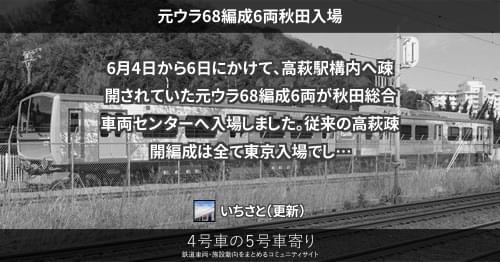 JRの車両その他(東) 元ウラ68編成6両秋田入場 6月4日から6日にかけて、高萩駅構内へ疎開されていた元ウラ68編成6両が秋田総合車両センターへ入場しました。 従来の高萩疎開編成は全て東京入場でしたが、最後の1本となった今回は遠路秋田まで配給されています。東京には後日、別の編成が入場する模様です。 2012/06/06 いちさと JRの車両その他(東)