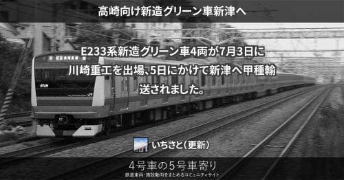 E233系新造グリーン車4両が7月3日に川崎重工を出場、5日にかけて新津へ甲種輸送されました。
