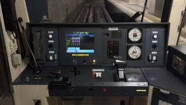 運転台にドア開閉ボタンやワンマン運転に対応する運転切換スイッチの設置が確認できます。