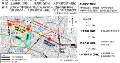 光が丘駅から大泉学園町駅(仮称)まで約4km延伸し、車両編成の増加に対応するため既存の高松車庫を改修するとしています。