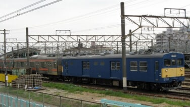 右から、クモヤ143-1、モハ204-44、モハ205-44…上の写真