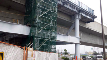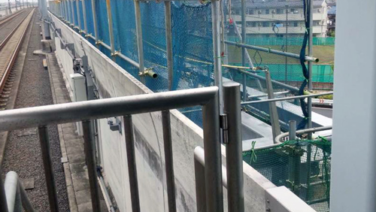 画像の通り、すでにホーム基礎が概ね完成しており、水色に塗られた鉄骨が組みあがっています。既設のホーム基礎とはデザインが一貫しておらず、後付けの部分が分かるようになっています。具体的には、既設のホームは高架橋(土木部分)で支えられていますが、新設のホームは地面から鉄骨を組んで支える形になっています。