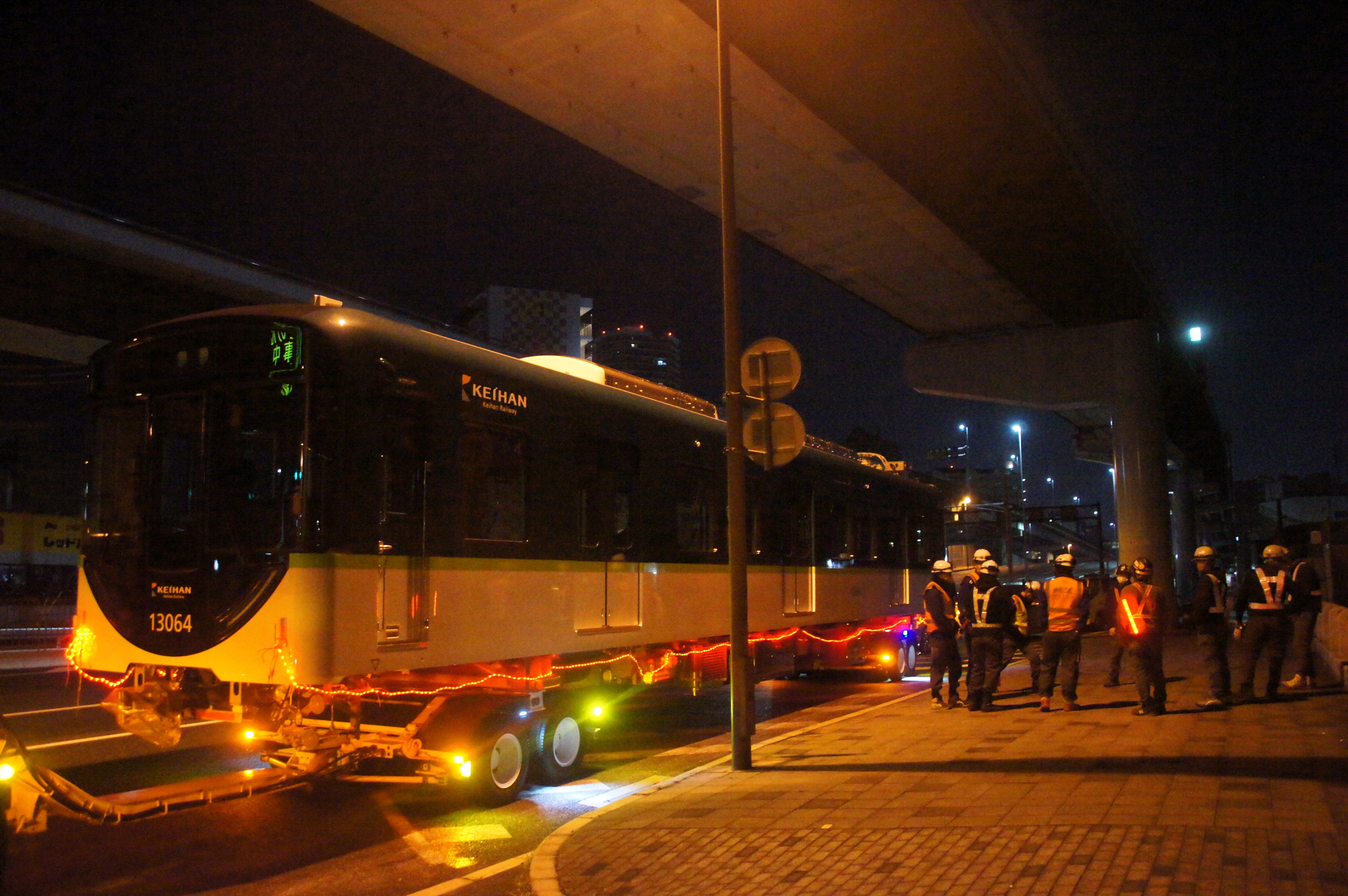 3月20日と24日の日程で、京阪電鉄13000系13014-④-13064(13014F)が川崎車両を出場し、寝屋川車両工場に陸送搬入されました。