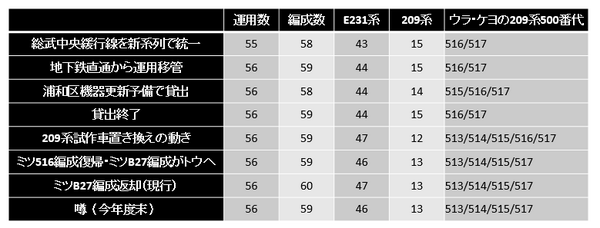 そのため、年度内に複数編成の転用が行われるであろうことが予測されていましたが、総研さんの通りだと年度末にE231系0番代が45編成、209系500番代とE231系500番代が14編成となり、妥当な範囲へ収まりそうですね。松戸車両セ…[ 続きを読む ]